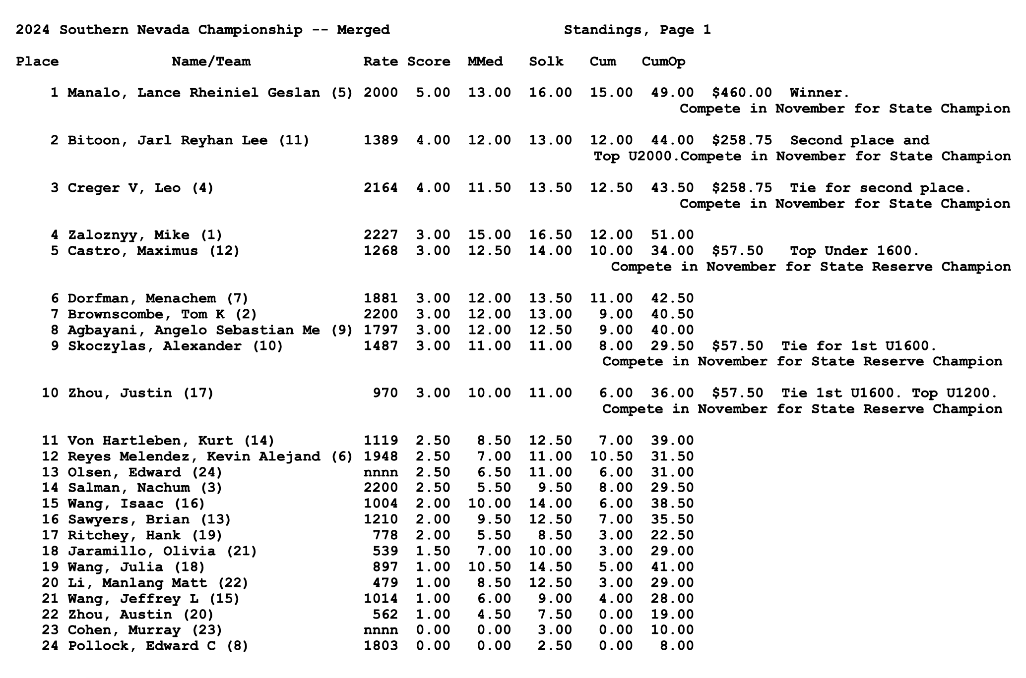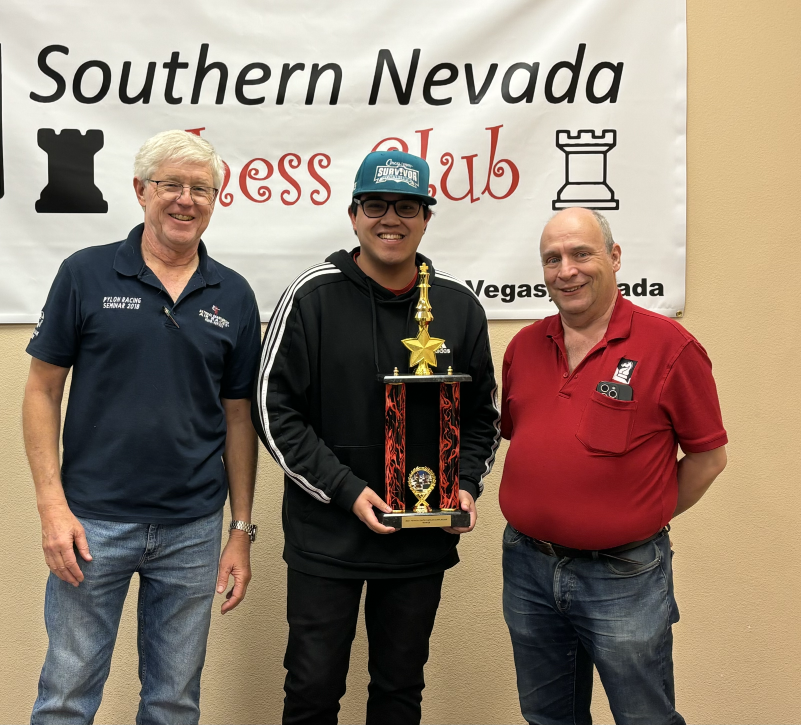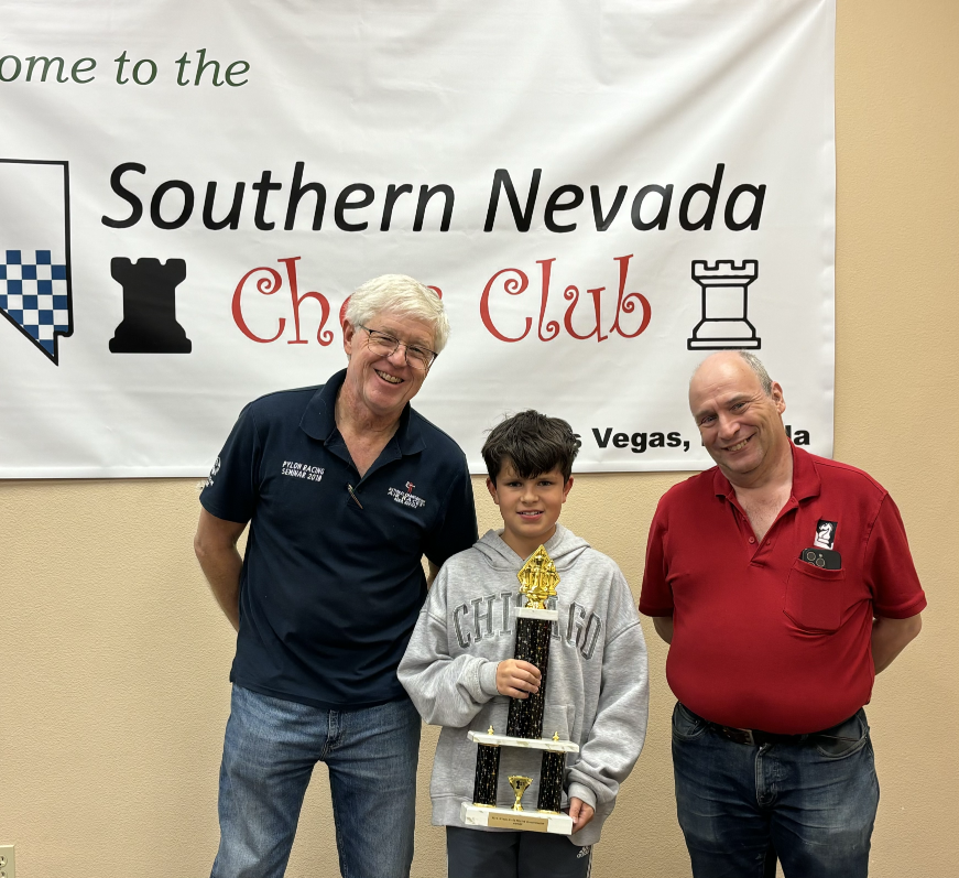Congratulations also goes to Alex Skoczylas (USCF 1542) also from Henderson NV who won the title of 2024 State Reserve Championship winner among players rated under 1600. Alex played in a Round Robin with Justin Zhou and Max Castro from Southern NV and Chris Richard, Alan Howe, and Eli Kaufman from Northern Nevada.