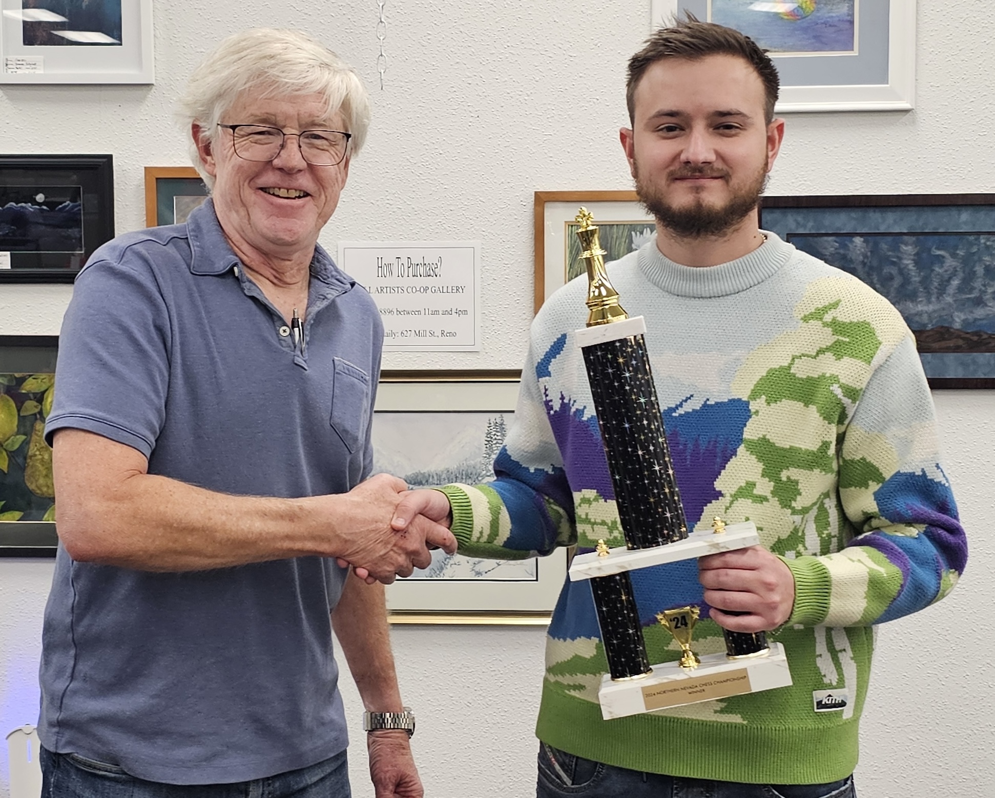 Congratulations to Daniil Fedunov on winning the 2024 Northern Nevada Championship, held at the Reno Chess Club on the weekend of October 11-13. Congratulations to Aastik Grover and Yajur Chandar for their tied finish in second place. Due to scheduling conflicts, players competing for the title of State Champion over the weekend of November 11-13 from both Northern and Southern Nevada may differ from the top three winners of the respective tournaments. Three top finishers from Northern and Southern Nevada rated Under 1600 will also compete for the first annual State Reserve Champion on the same weekend. In the photo below, Chief TD and Reno Chess Club President Fred Roscher awards the trophy to Daniil.